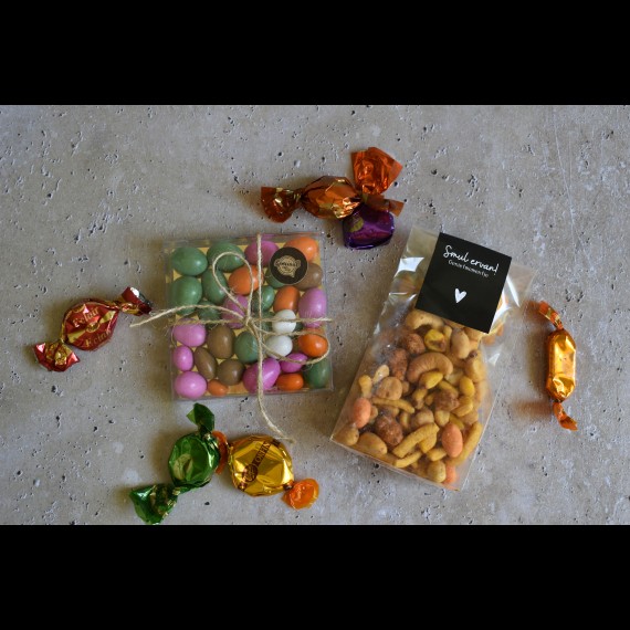 Dit pakketje bevat een zakje nootjes, toffees en een luxe doosje gekleurde chocolade pinda's.